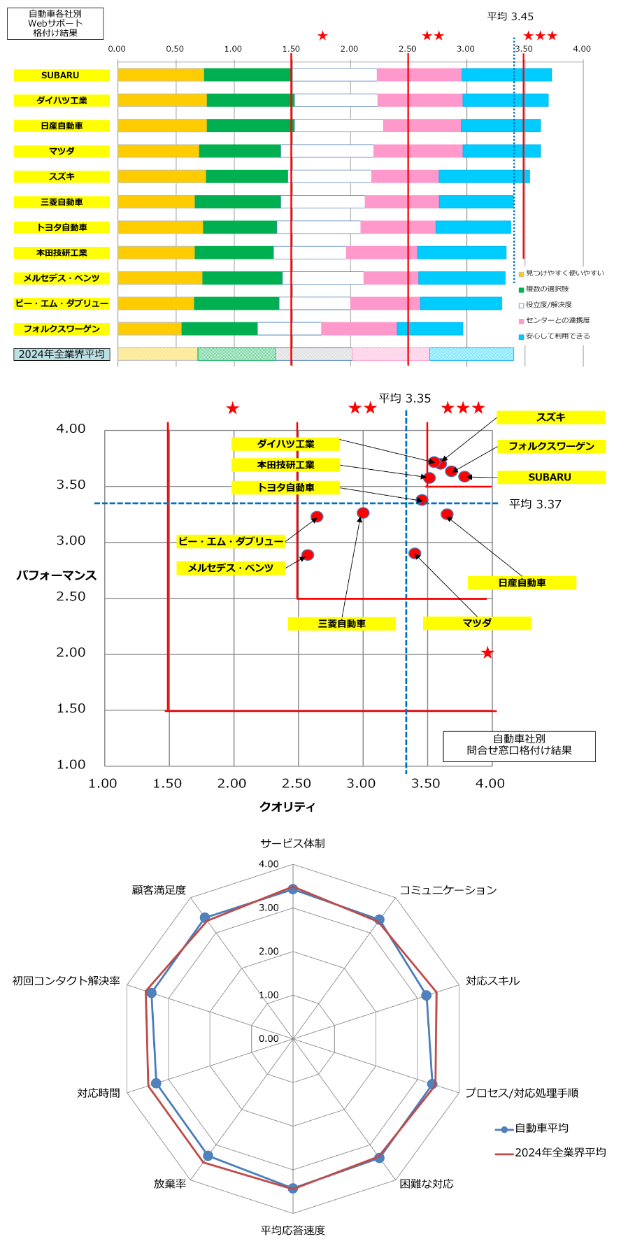 Webサポートは、三つ星5社、二つ星6社という結果で、一つ星、星なしは該当がありませんでした。自動車業界は2024年全業界平均と比べて「見つけやすく使いやすい」「複数の選択肢」「役立度/解決度」が高評価となっています。Webサポートで高評価のところは、目的の情報に速やかにアクセスでき、デザインや仕様など細かな点まで具体的に確認できるのでイメージが鮮明になります。車種比較から試乗予約までスムーズに行え、検討から購入までの情報が手間なく収集できます。購入後のイメージを広げる豊富なコンテンツがあり、信頼性と楽しさを兼ね備えています。一方低評価のところは専門的な内容が多く分かりにくいことやセンターとの連携が弱く、必要なタイミングで情報が得られないことがあります。 ■ 要望に応じた的確な情報提供 問合せ対応は、三つ星5社、二つ星6社という結果で、一つ星、星なしは該当がありませんでした。自動車業界は2024年全業界平均と比べて「コミュニケーション」「困難な対応」「顧客満足度」は高評価だが、その他の項目は下回る結果となっています。 クオリティで高評価のところは、問合せの背景や意図を丁寧に確認し、復唱や質問を通じて関係を築き、要望に応じた的確な情報提供を行っています。共感を示しながら会話を進めるので話しやすく、自然な会話を通じて車種の魅力を伝えています。一方評価が伸び悩んだところは、ニーズの把握が不充分なことや、Webに掲載されている情報提供のみにとどまり車種の魅力を十分に伝えられていない傾向があります。 パフォーマンスで高評価のところは、自動音声応答がシンプルで迷わず操作でき、すぐ担当者につながります。要望に合わせた的確かつ有意義な情報提供により顧客の興味を高めています。一方評価が伸び悩んだところは、回答までに時間を要し、形式的な回答のみで顧客の期待に応えられないケースが見受けられます。 ■ HDI格付けベンチマークの主旨 顧客と企業の関係について様々な顧客満足度調査が行われていますが、企業と顧客の接点である「Webサポート/問合せ窓口」にフォーカスし、その利用者である消費者が評価したデータはこれまでほとんど見られませんでした。そこで一般消費者からボランティアの審査員を募り、完全に顧客の視点から各企業のWebサポートと、問合せ窓口のパフォーマンスとクオリティを評価し、それを格付けとして公開することとしました。 HDI格付けベンチマークにより現状を知り改善が行え、また他社の位置や動きも見えてきます。経営層も格付けベンチマーク結果に注目しセンターは改善されていきます。これはサービスを受けている顧客にも恩恵があり、顧客の購買行動が促進できれば企業の利益につながります。HDI格付けベンチマークはサービスレベルの向上、競争力の向上およびサポートセンターの地位向上に寄与することを目的としています。 ■ 「格付け」方法 HDI格付けベンチマークは、HDIの国際標準に基づいて設定された評価基準に沿って、一般ユーザと専門家が顧客の立場から評価し、格付けをします。格付けは三つ星〜星なしの4段階です。