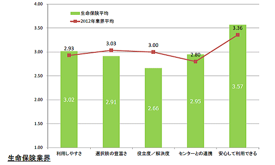 サポートポータルは、三つ星5社、二つ星11社、一つ星3社という結果で、星なしは該当がなかった。生命保険業界は、「選択肢の豊富さ」「役立度/解決度」が2012年業界平均より低い評価となっている。一方「安心して利用できる」かは、非常に評価が高い。 |
